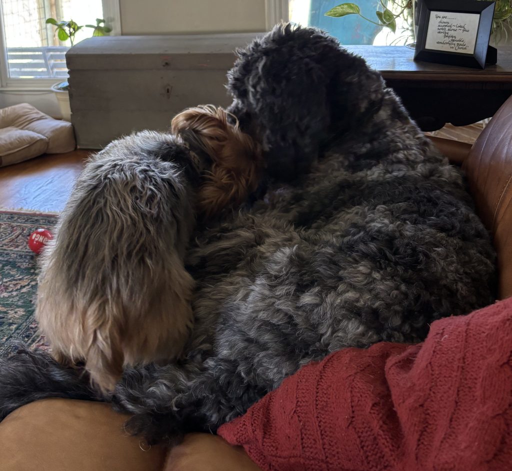 He still assaults me when he wants to play. He just thinks we’re having fun. I snarl and growl and run away and hide in one of the safe spaces. But when he pouts, I come right back to kiss him, sit with him, and make sure he is okay. I’m still his big brother.