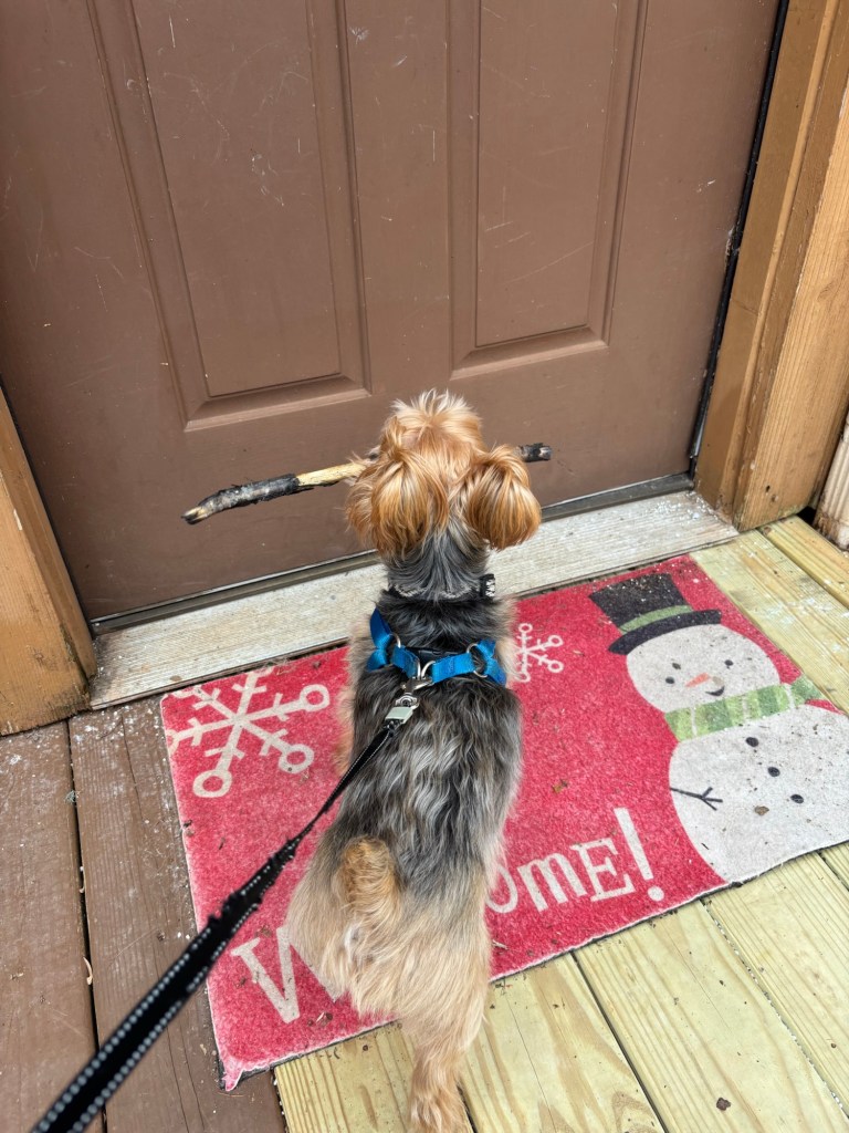 Ever since that momentous day, here’s how it goes. Right before re-entry, I grab the biggest stick I can find and head for the door. I run up the stairs and lie down on the living room floor with the stick between both paws. I start chewing.