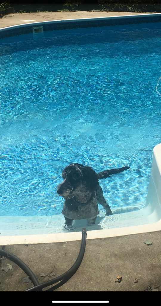 My younger brother pup—Beauregard, the giant doodle—is so excited. It’s May, which means his swimming pool is open! He’s already been in once, and he can’t wait to enjoy the summer swimming season.