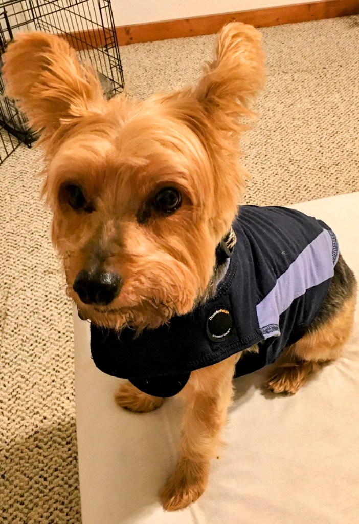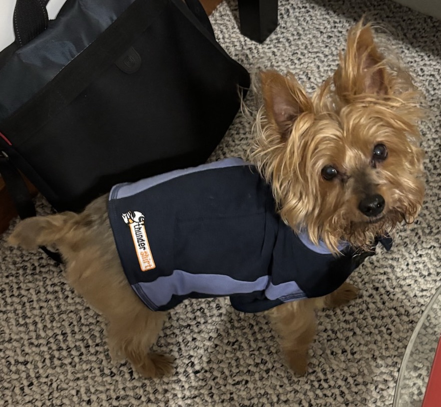 When Miss Janet realizes an approaching storm is causing my freak out, she wraps my thunder shirt around me. My thunder shirt puts gentle pressure on my torso, which helps calm me. The gentle pressure also releases hormones that reduce my anxiety.