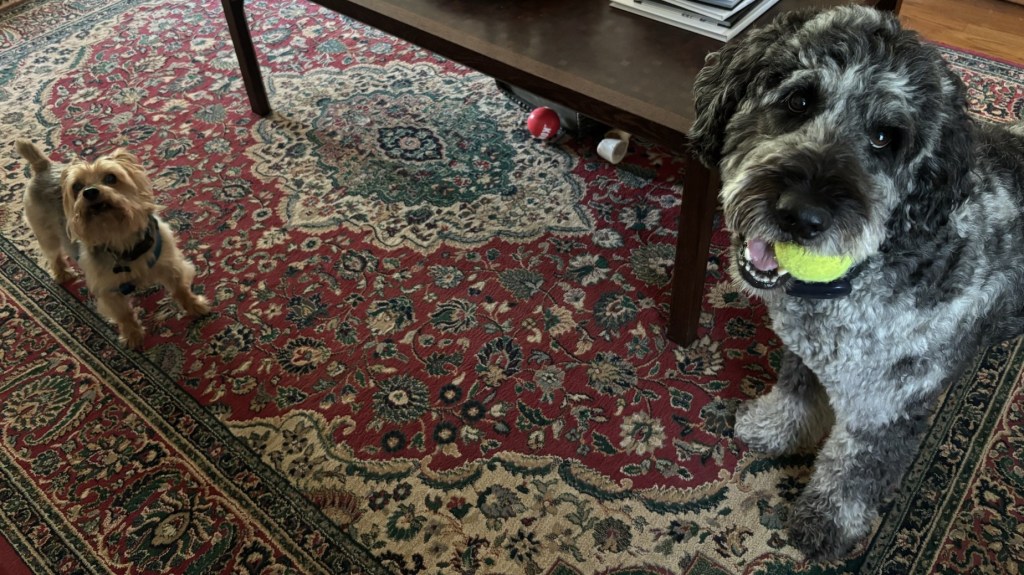 Miss Janet doesn’t have to pack any of my toys because it’s fun to play with Beauregard’s toys. He lets me pick out whichever toys I want to play with. He really wants me to play with him, but I prefer to play alongside him. He is so gigantic that I can’t handle him jumping on me or throwing a Kong at me that’s bigger than my head.