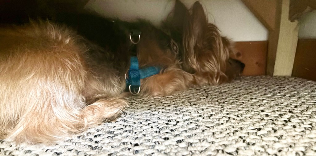 Eventually, the worst of the noise is over. I feel safe to crawl out from under the nightstand. I’m ready for a comfy nap on the couch.