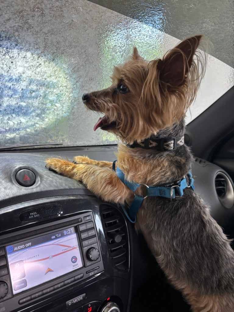 I love it when Miss Janet tells me I can ride in the car with her. The motion of the car feels like an adventure. I get to go somewhere. I don’t always know where we’re going, but the important thing is, I get to go! Through the window, I see so many interesting things—trees, birds, people, other dogs riding in their cars too.