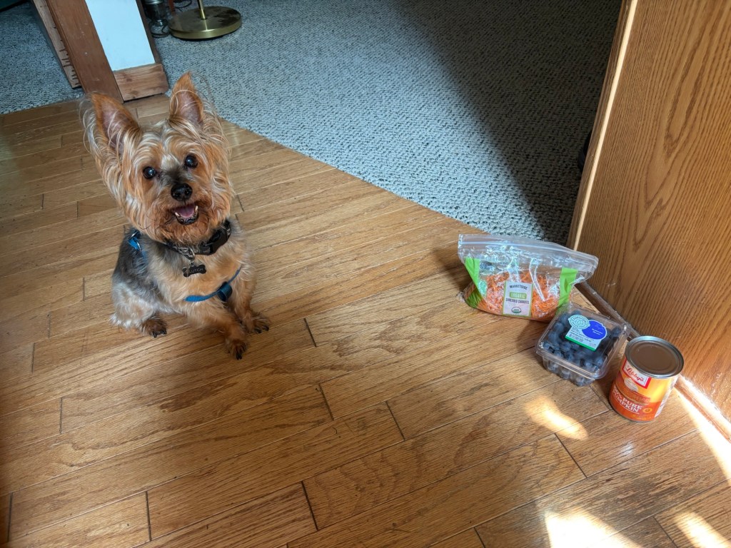 I love my dog food and doggy treats that we get at the store or in the mail. But I also love those fruits and veggies in the grocery bags. Miss Janet gives them to me as a snack.