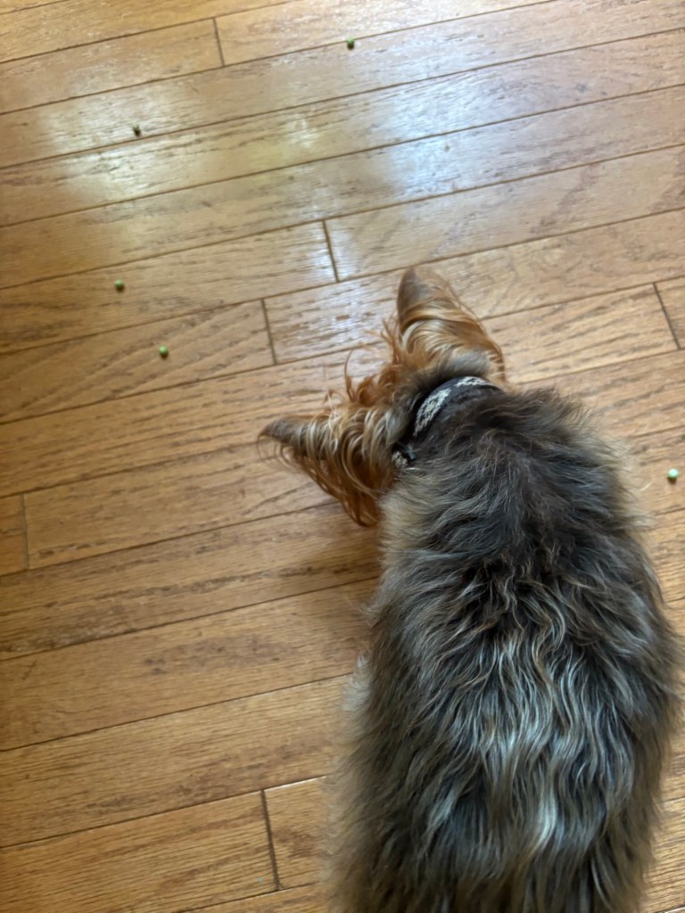 - Green Peas — I like these frozen and just slightly warmed up to room temperature — Miss Janet runs them through warm water for a few seconds before serving. I like them in my dish, but I also love to chase and eat them if you roll them on the floor. That’s great fun!