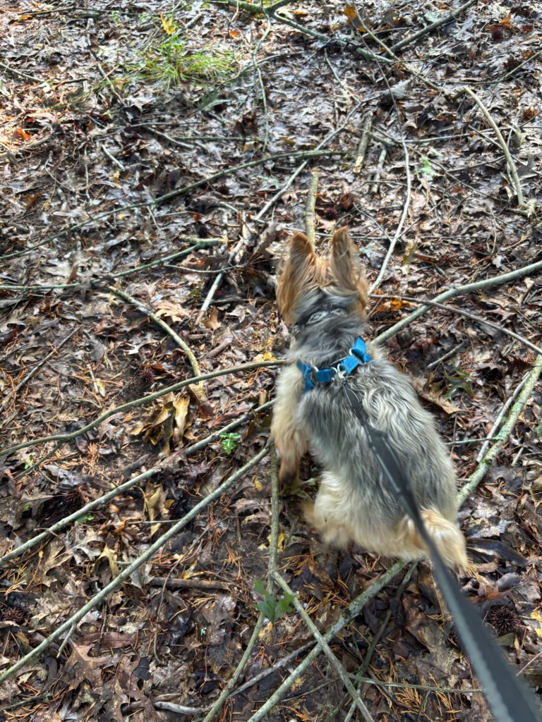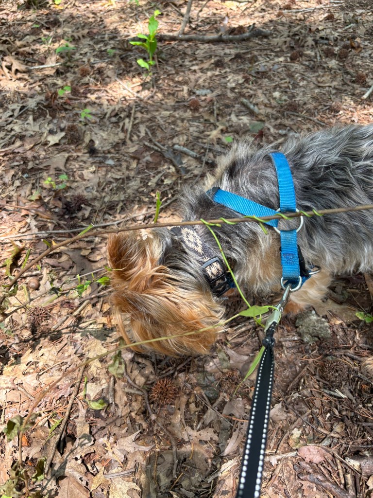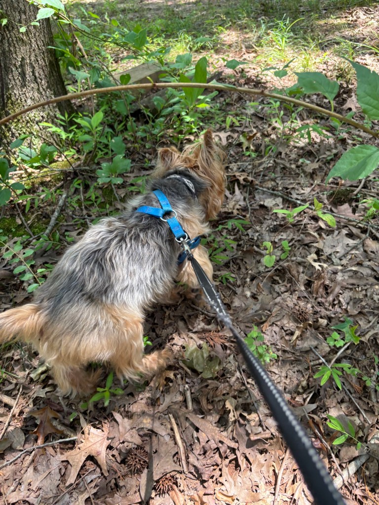 The more obstacles on the ground, the more I get to explore. So many things to sniff, so many creatures scurrying. We never know who or what we will discover. Maybe a chipmunk. Maybe a tasty bug. Or the soft ground cover I love to roll in. It spreads over the jungle floor all summer with its tiny purple flowers.