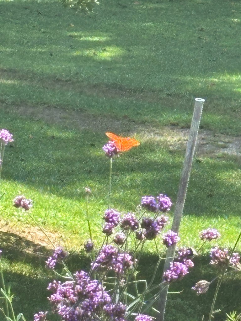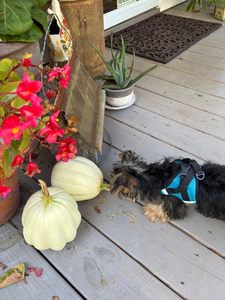 In the mornings, I got to relax in my chill-time crate on the porch. Beauregard sat down next to me. We were right by the garden, and it was fun to watch the butterflies and bees enjoying the flowers.