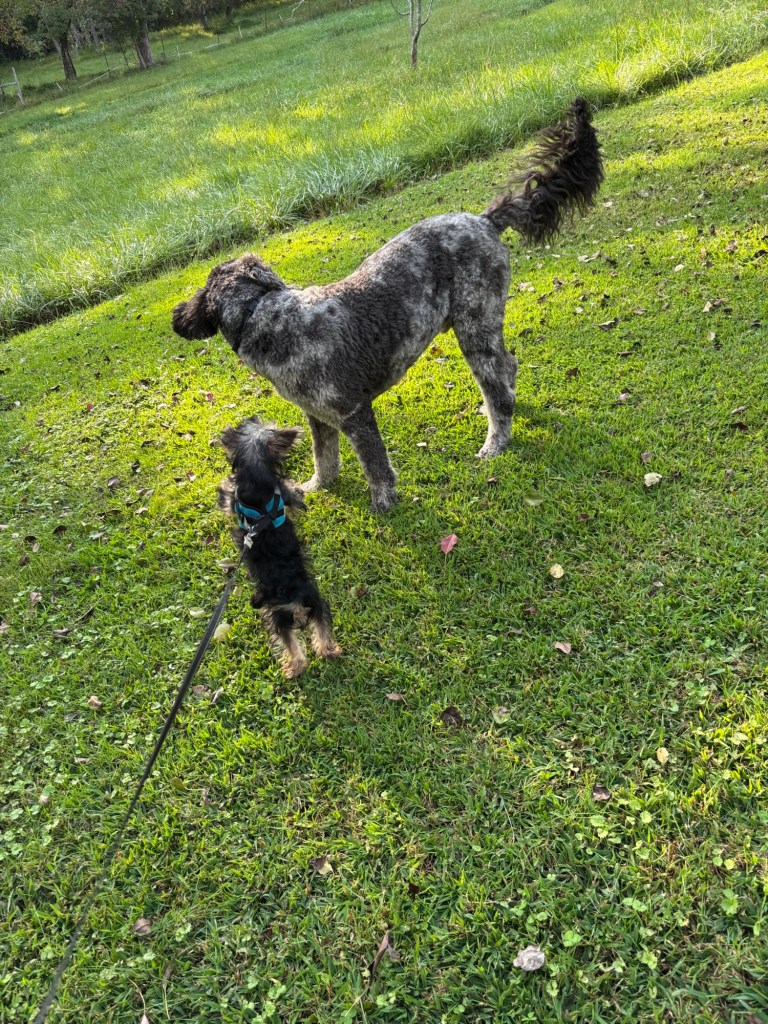 Sometimes, she took us both outside at the same time, with me on my harness and leash for safety. Beauregard ran big zoomie circles around me. I tried to jump after him, and he jumped away, as if he thought I could catch him. It was fun. Then we’d walk through the fields together, with Beauregard leading the way.