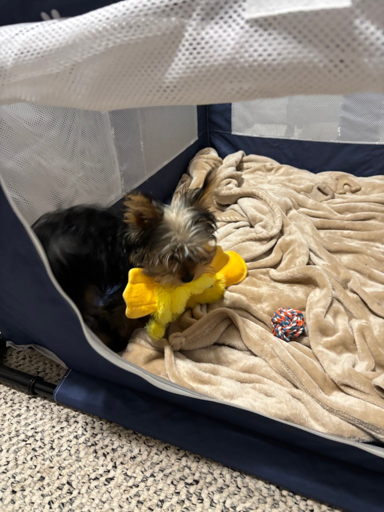 And here’s the best part. I get to run free in the living room now (supervised) in between my chill times. Miss Janet can roll up the side doorway of the playpen so I can go in and out. I can go in if I want to feel safe. Or I can grab a toy and go back out and play with the toy in the living room. It’s so cool!