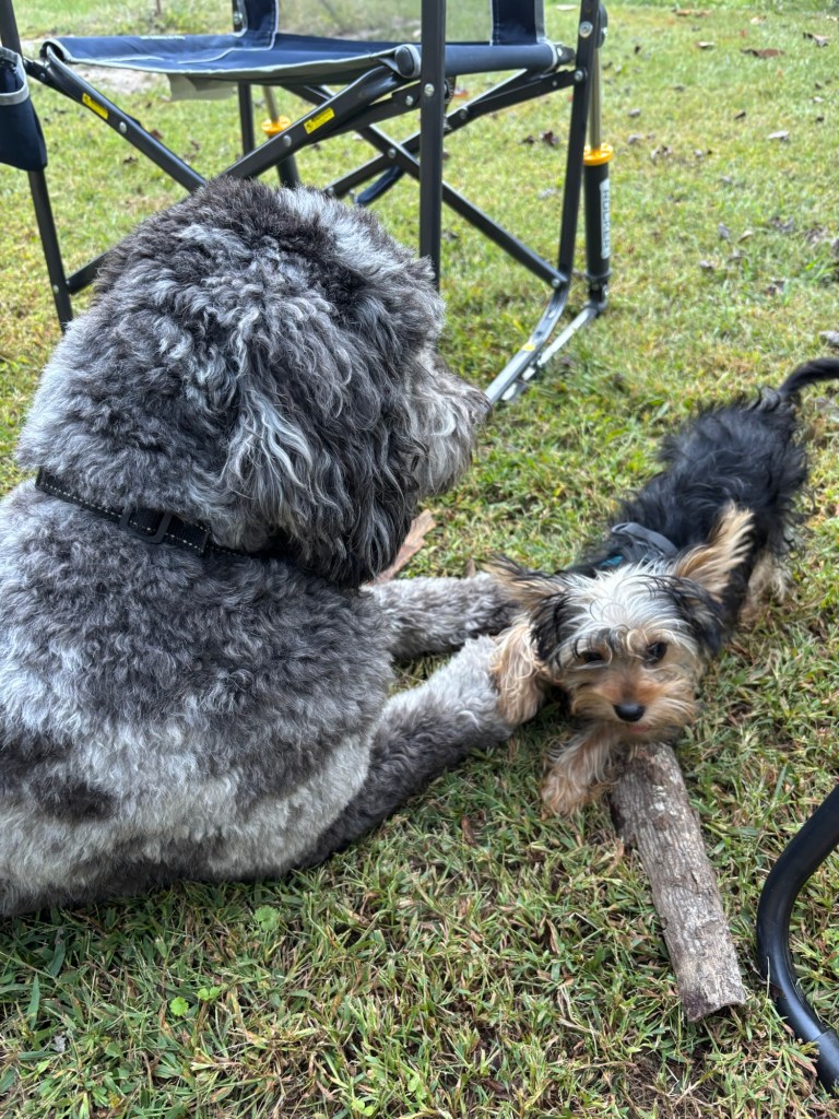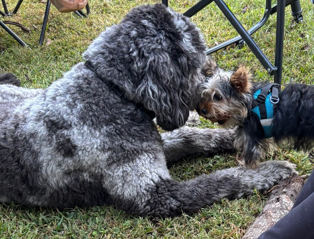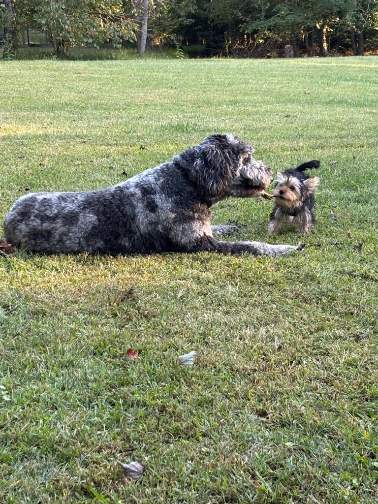 Next thing I knew, we were in Beauregard’s yard. He is my neighbor—a giant doodle—and he is like a big brother to me. Lots of my aunts were arriving too. I was so excited to see everyone. Beauregard ran up to greet me.