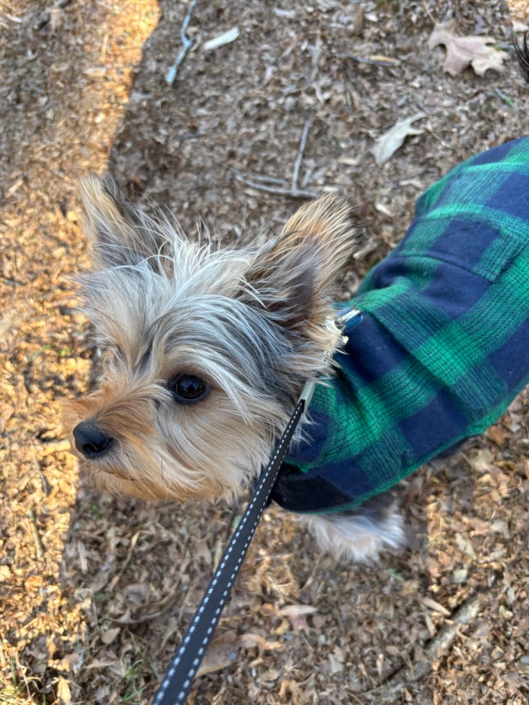 I like to stretch a little. Miss Janet cuddles and greets me. Then she helps me put on my harness. It’s really easy. I just step in, and she does the rest. I used to fight it, but I never won. I finally realized if I don’t put on my harness, I don’t get to explore outside. If the cold front monster is visiting, I put on my winter coat too.