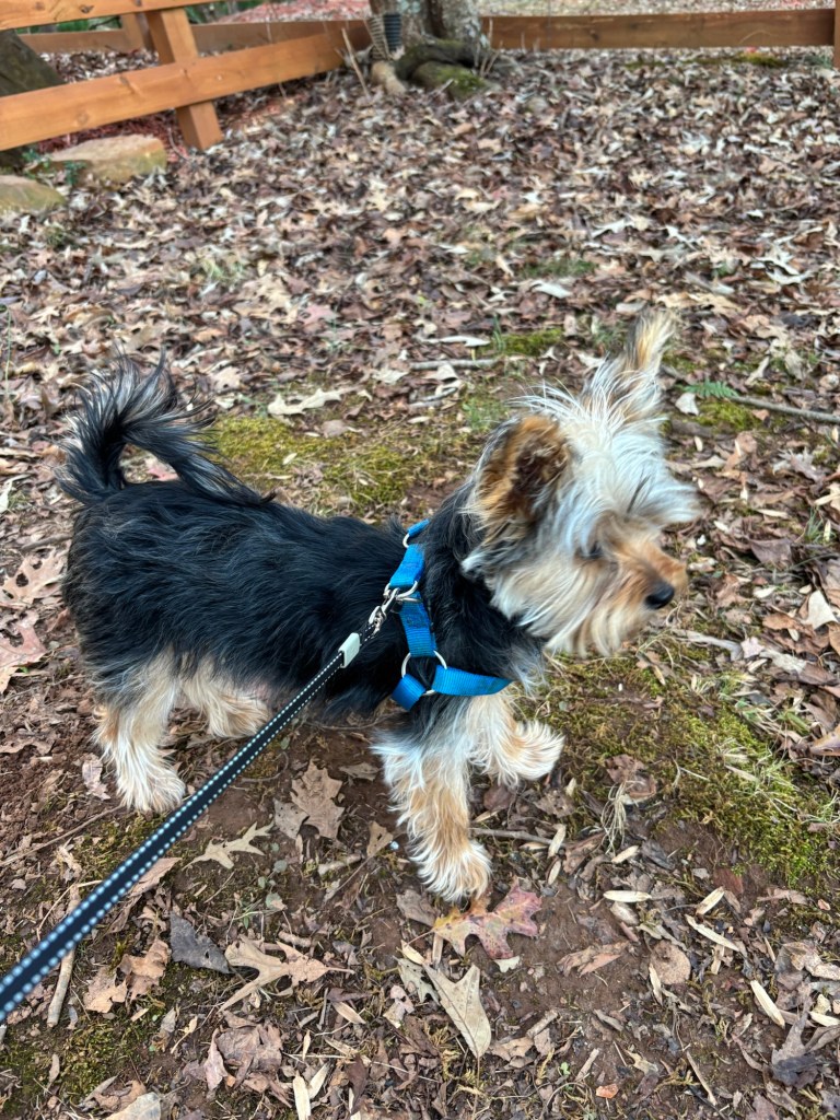 Our yard is filled with trees, and every morning, birds are settled in the branches. I race to greet them, and they all chirp and fly to higher branches to get out of my way. Silly birds. It’s not like I can catch them. I’m on a harness and leash.