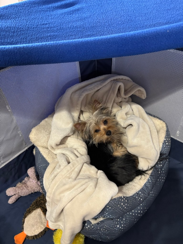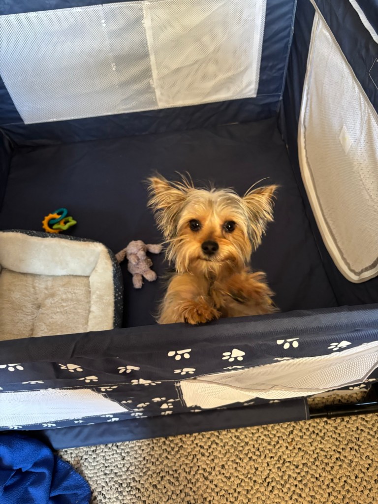I could tell Miss Janet was very nervous and stressed. So I tried to be on my best behavior. She made me a cozy area in my playpen with a double-decker bed, fleece blanket, and a blanket roof! I settled right in and figured the best way I could help was to take a nap.