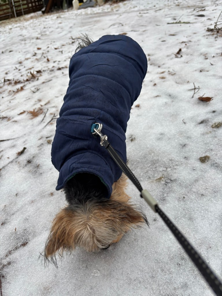 We didn’t stay out too long. Our home felt nice and toasty when we got back inside. Miss Janet put a tiny amount of doggy coconut oil on my paws to keep them from getting too dry. I love the smell of coconut oil and wanted to lick my paws. She said I couldn’t lick for five minutes, so she just held me still while I stretched and squirmed. It was good exercise.