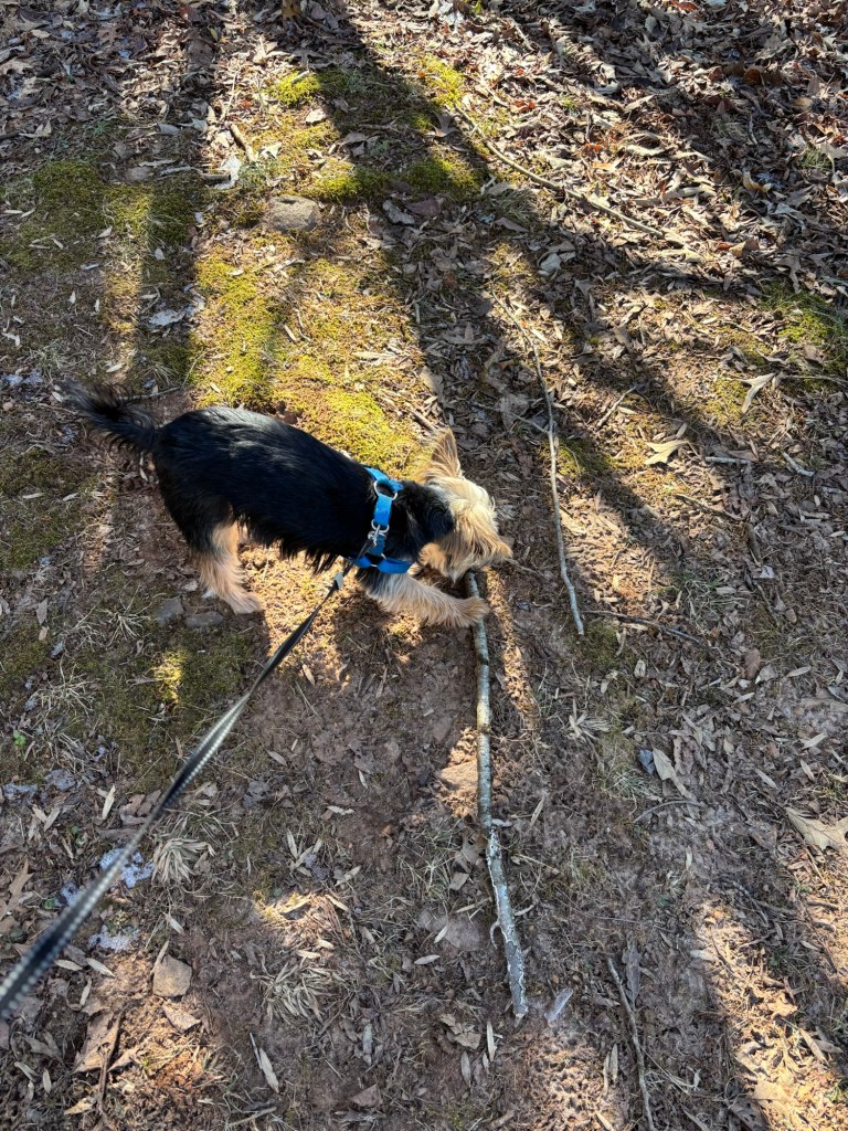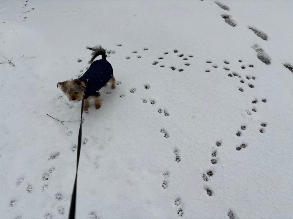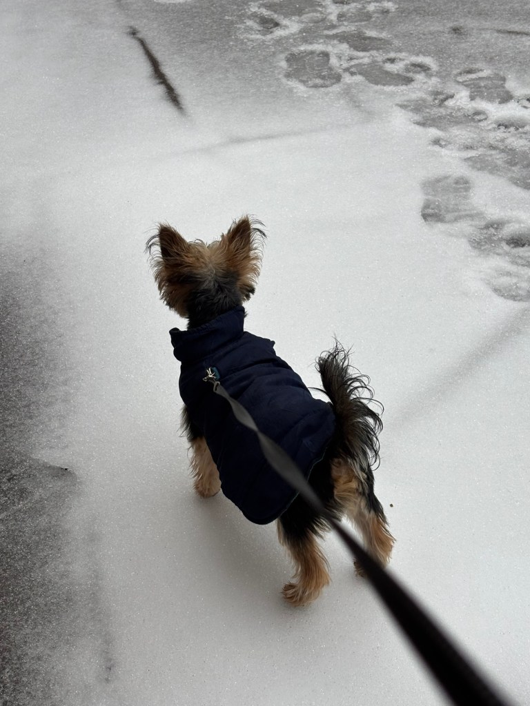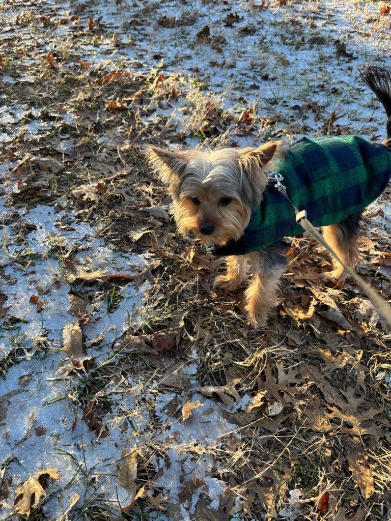 The next day was calm with lots of sunshine, indoor heat, and melting ice. The backyard was still half frozen. Miss Janet found a walking path for us that didn’t have ice. We zigzagged through the yard. But I enjoyed walking on the ice right next to her path. It was cool and fun. And I’m a chillin’ pup.