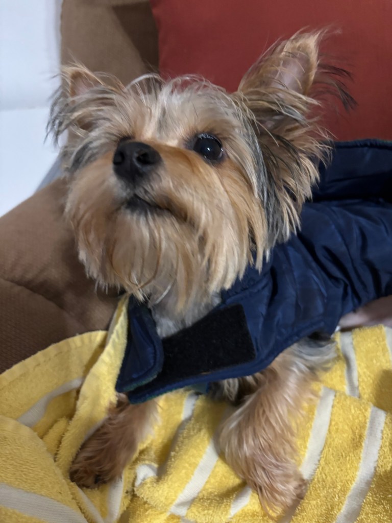 I spent some time napping in my playpen. Miss Janet set up half my playpen for staying warm and the other half for cooling off, in case I got too hot. While I get easily chilled outdoors, as an eight-month-old Yorkie puppy, I know how to regulate my temperature indoors. I’ve learned that when my cozy dog bed gets too warm, I can flip it over to the cooler side. I love having choices.