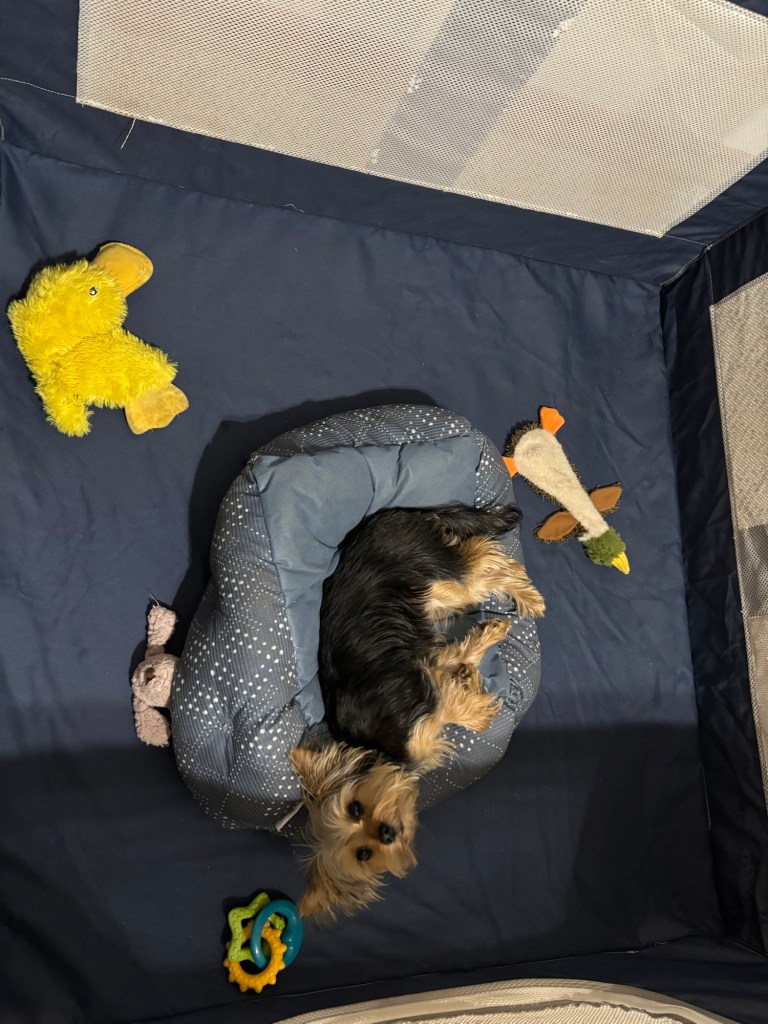 Now that I’m a big, nine-month-old Yorkie puppy, she can volunteer again. I was very excited to help her prepare for her big night out. When I got in my crate, I was on my best behavior, showing her I was ready for a calm, relaxing evening at home while she went out.