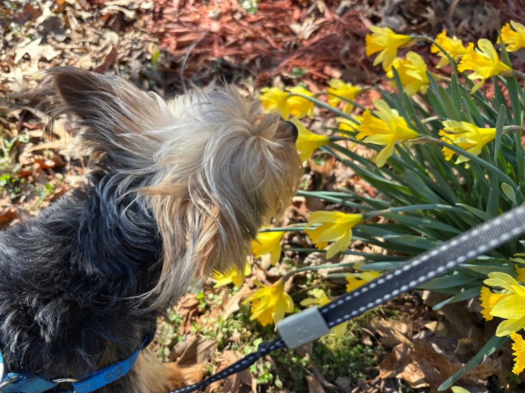 There are so many scents in the air. So much is happening. The pretty yellow daffodils are blooming all over the yard. I take the time to stop and smell each one.