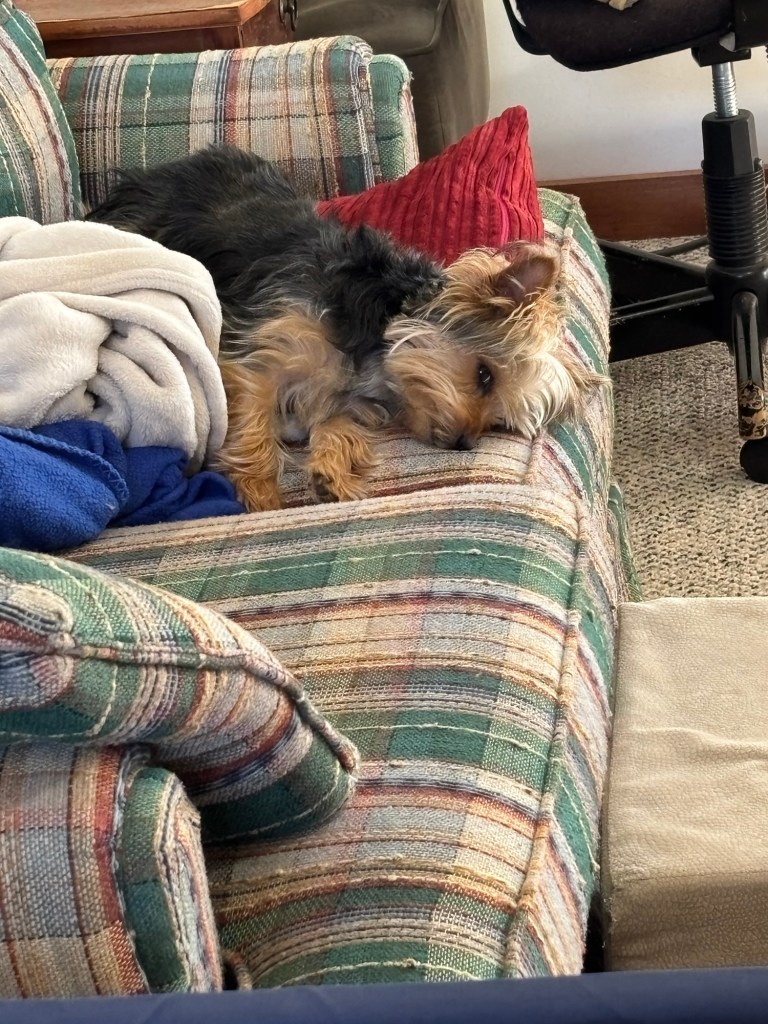 Did you know we Yorkies only have a single coat? Many dogs have an undercoat that helps them stay warm in winter. We Yorkies don’t have an undercoat. We have hair that grows out just like you do. So we tend to feel chilly when the cold front monster visits.