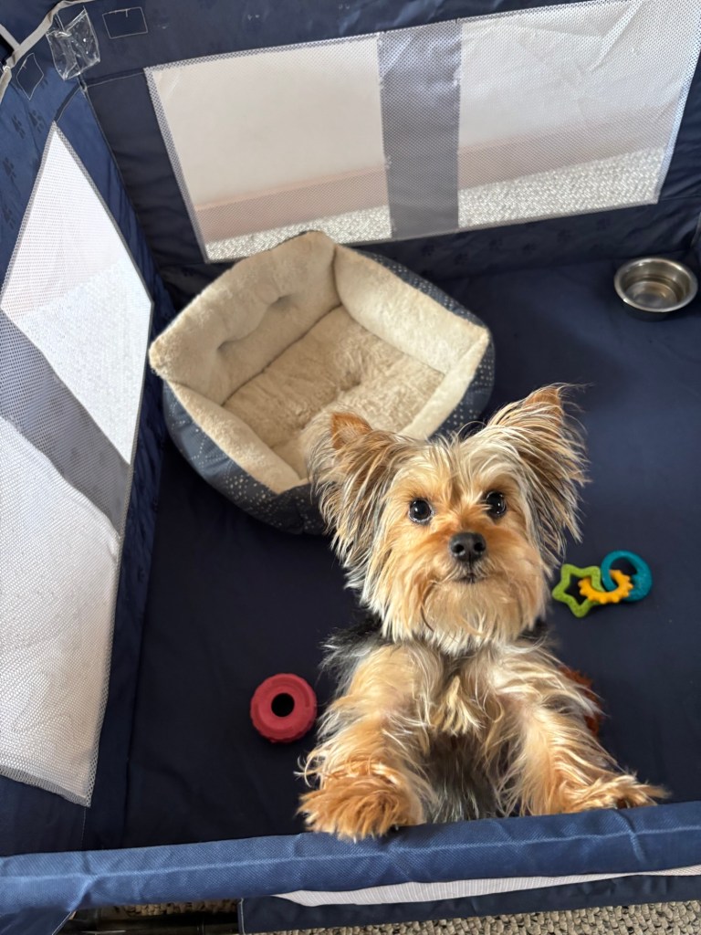 When we got back inside, I went into my playpen fortress and immediately rearranged the furniture. I moved my bed to the back where I felt more secure and my toys to the front so I could throw them if an intruder came in. I got into bed for my evening nap but didn’t feel settled.
