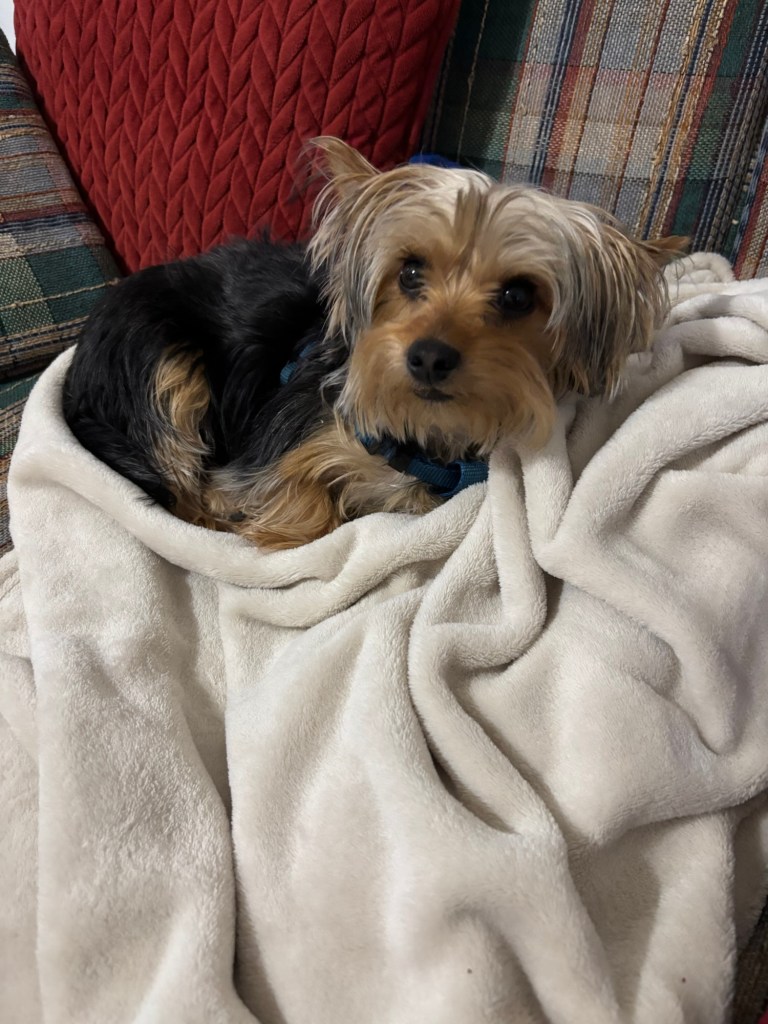 I was chilling on my couch blanket when Miss Janet picked me up and carried me out to the car. She said we had some errands. I had to get ready for a road trip. What’s a road trip? Is it longer than a ride to the groomer?