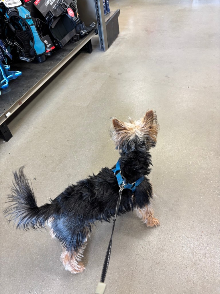 We drove to the pet shop. I hadn’t been there since I outgrew my puppy harnesses. The last time we went to the pet shop, I was in my backpack carrier. This time, I was on my harness and leash. Miss Janet wanted me to walk myself inside the shop.