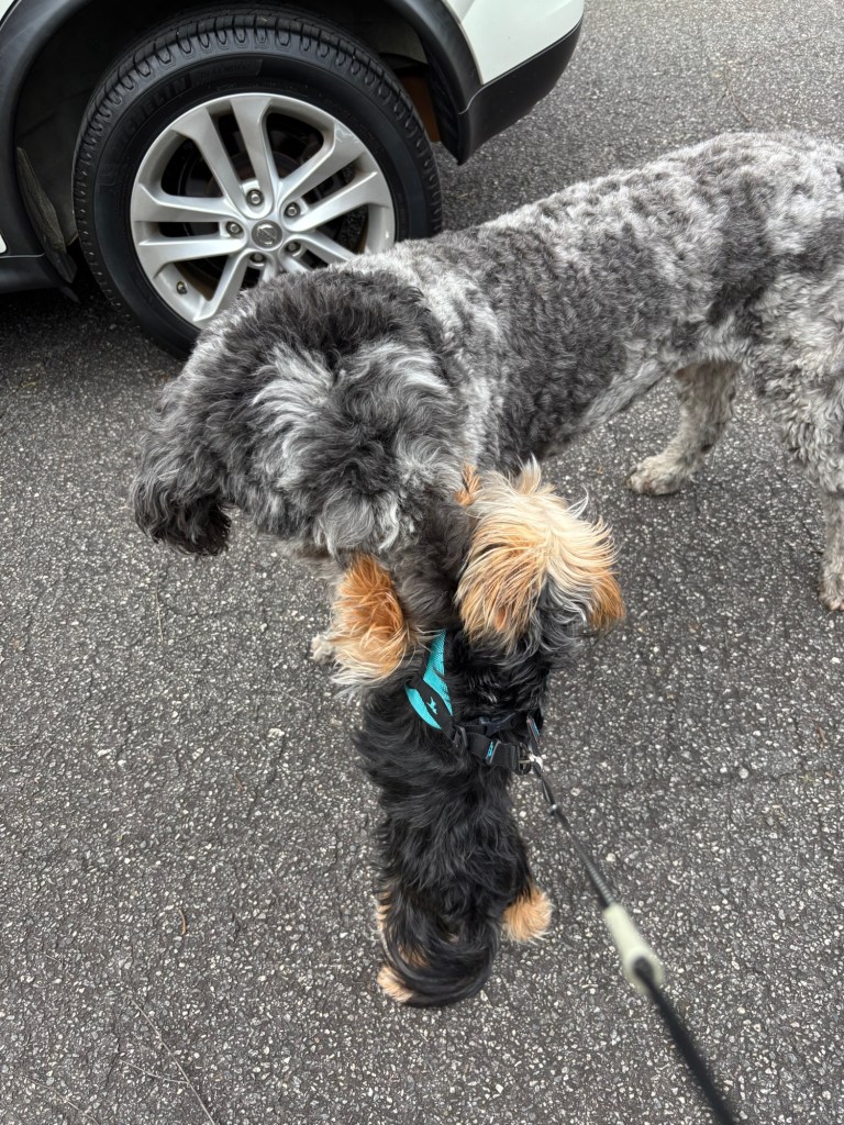 After we left the pet shop, we went to visit Beauregard, my giant doodle friend who lives on a nearby farm. I had fun playing with Beauregard. It gave Miss Janet a chance to test out my new harness. She said if I could chase after Beauregard through the fields without my harness getting loose, I would be safe on my road trip.