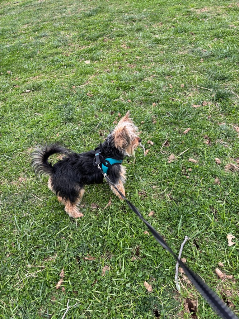 We went to a park in town, and Miss Janet let me run on my new harness and leash. I chased a rodent-squirrel and ran up to a family I wanted to meet. I ran all over the park and smelled a big tree where many animals had stopped by. So many sounds, smells, people, birds. I was sleepy when we left.