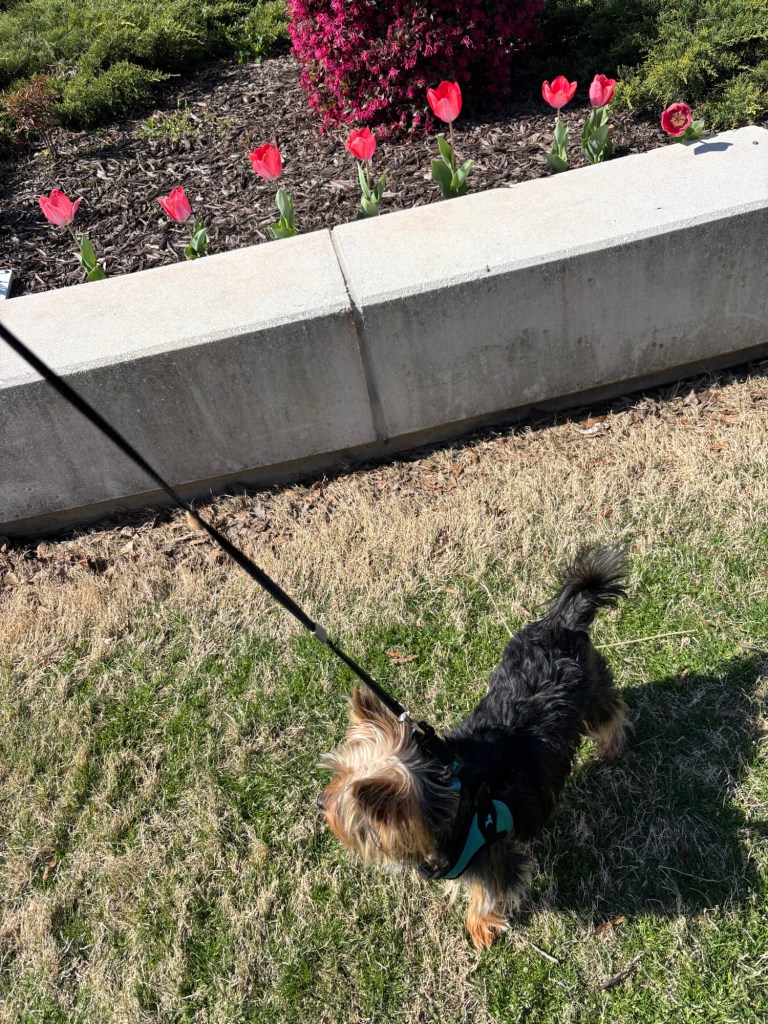 The sidewalks, the noise, the people, the smells! Everything was spinning around me. Miss Janet thought it would be a good idea to find a patch of grass. We found a park with really pretty flowers. When my paws touched the grass, I felt a little more settled.