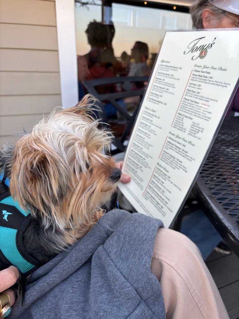 We got to another outdoor restaurant. My aunt let me sit in her lap and read the menu with her. I couldn’t really eat anything from the menu, but it was fun to pretend. Miss Janet got me some water and gave me a few of my salmon treats from home.