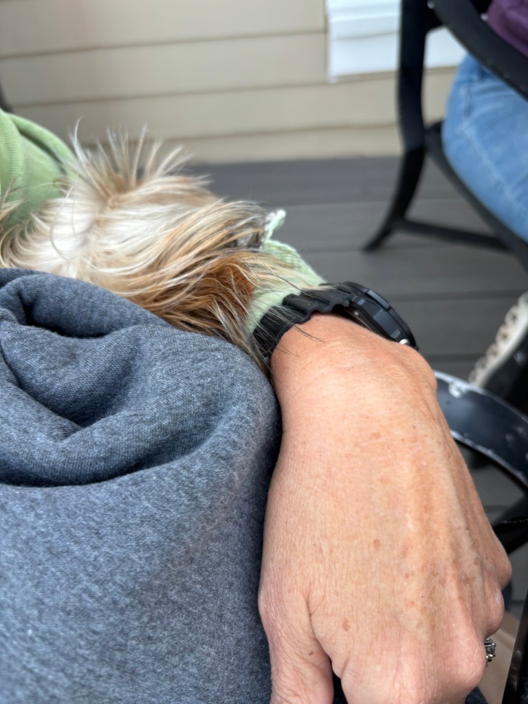 I was so excited to see her familiar face. I felt all wiggly. She picked me up and brought me out to the patio. Wow! More of my aunts were there. I was so happy to see them. Even though we weren’t at home, it kind of felt like home. I felt more settled.