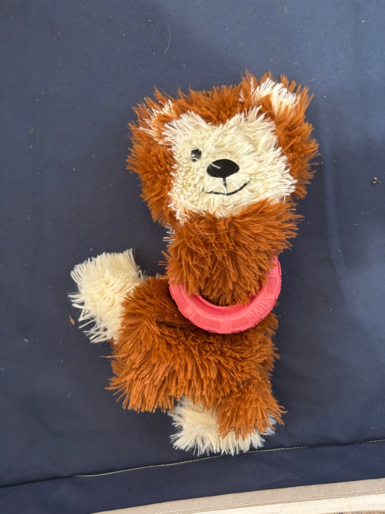 It’s also easier to play with those light plushy toys when they are weighted down. The puppy tire holds the monkey in place, so I can have a wild time chewing or rubbing my face on the plushy toy.