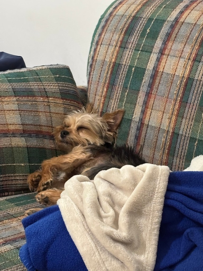All that watching, listening, and sniffing makes me sleepy. I take a lot more naps every day. They are shorter naps, and I’m still kind of alert. But it’s nice to stretch out and close my eyes.