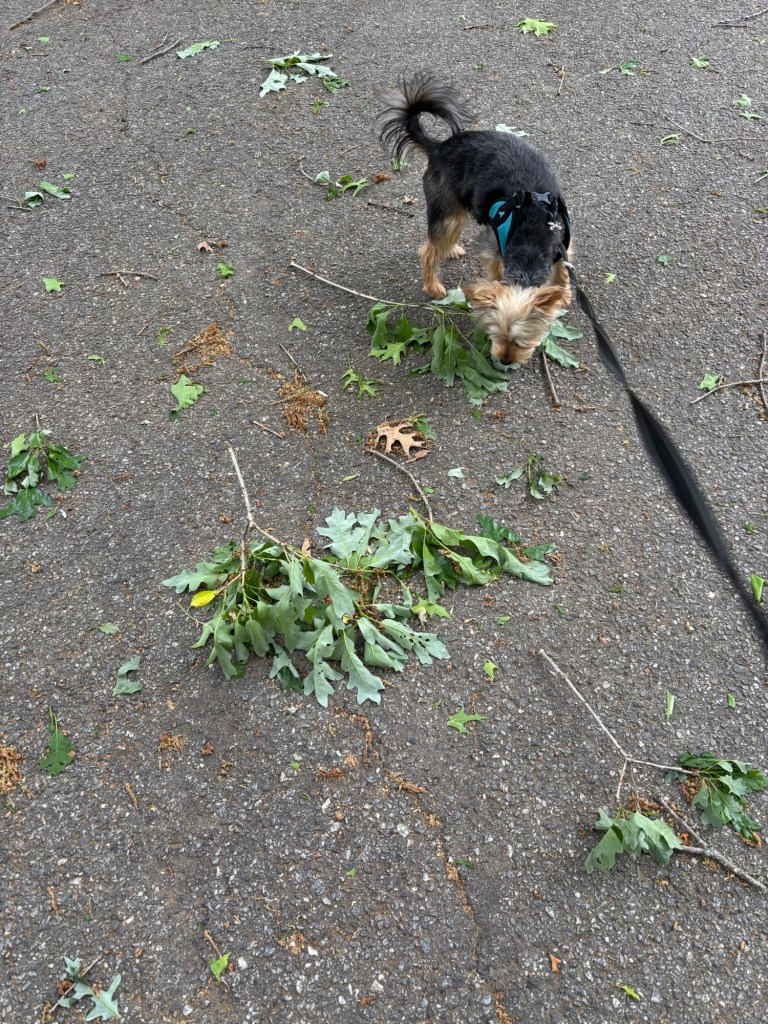 Some of those leaves ended up on the ground because of the wind. I had to sniff through all of them. That’s how I can learn about all the birds fluttering in the trees. They leave their scent on the leaves, and when that scent floats down to the ground, I must always check it out.